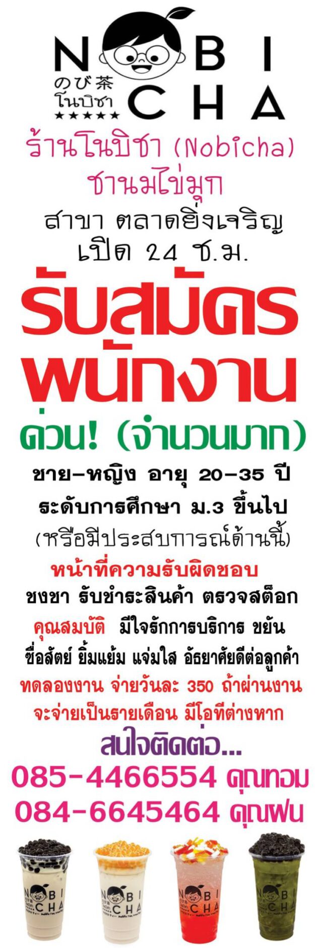 ประกาศรับสมัครพนักงานชงชา (ชาย) โนบิชา สาขาเซ็นทรัลแจ้งวัฒนะ